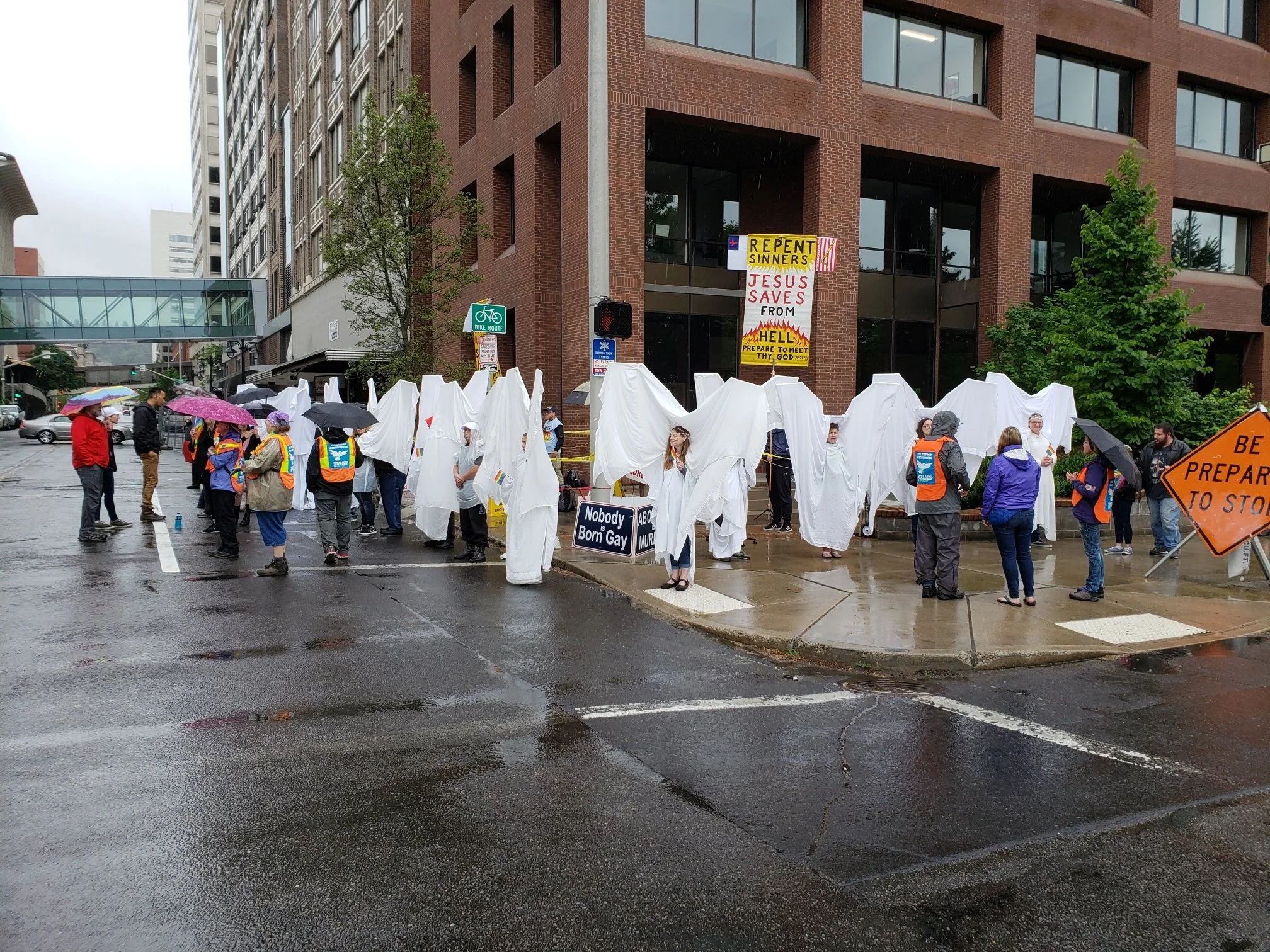 The Angels are really starting to grow in numbers by this year and we had 10 Angels and the protesters had about 7 to 8. We were getting stronger and showing them we were not going to back down. This year was hard as it was the year the fountain was being built at Riverfront Park and there was no barricade area for the protesters, but we blocked them out.