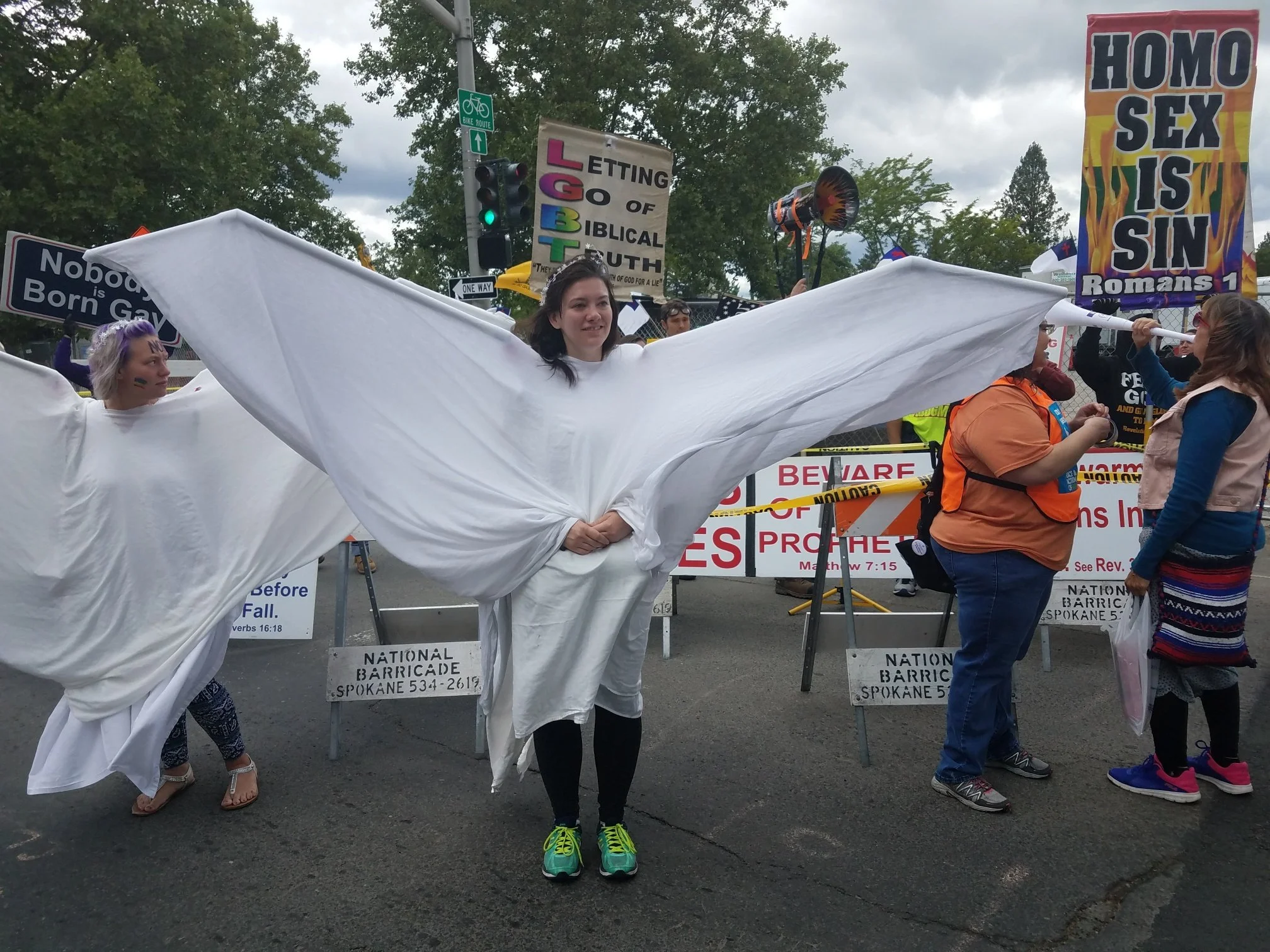 I got in touch with the Board of Directors from OutSpokane (now Spokane Pride) and let them know that I would like to bring the Angels back to Pride and start blocking the protesters again. They all liked the idea and agreed to help me with getting the materials to make it happen.
