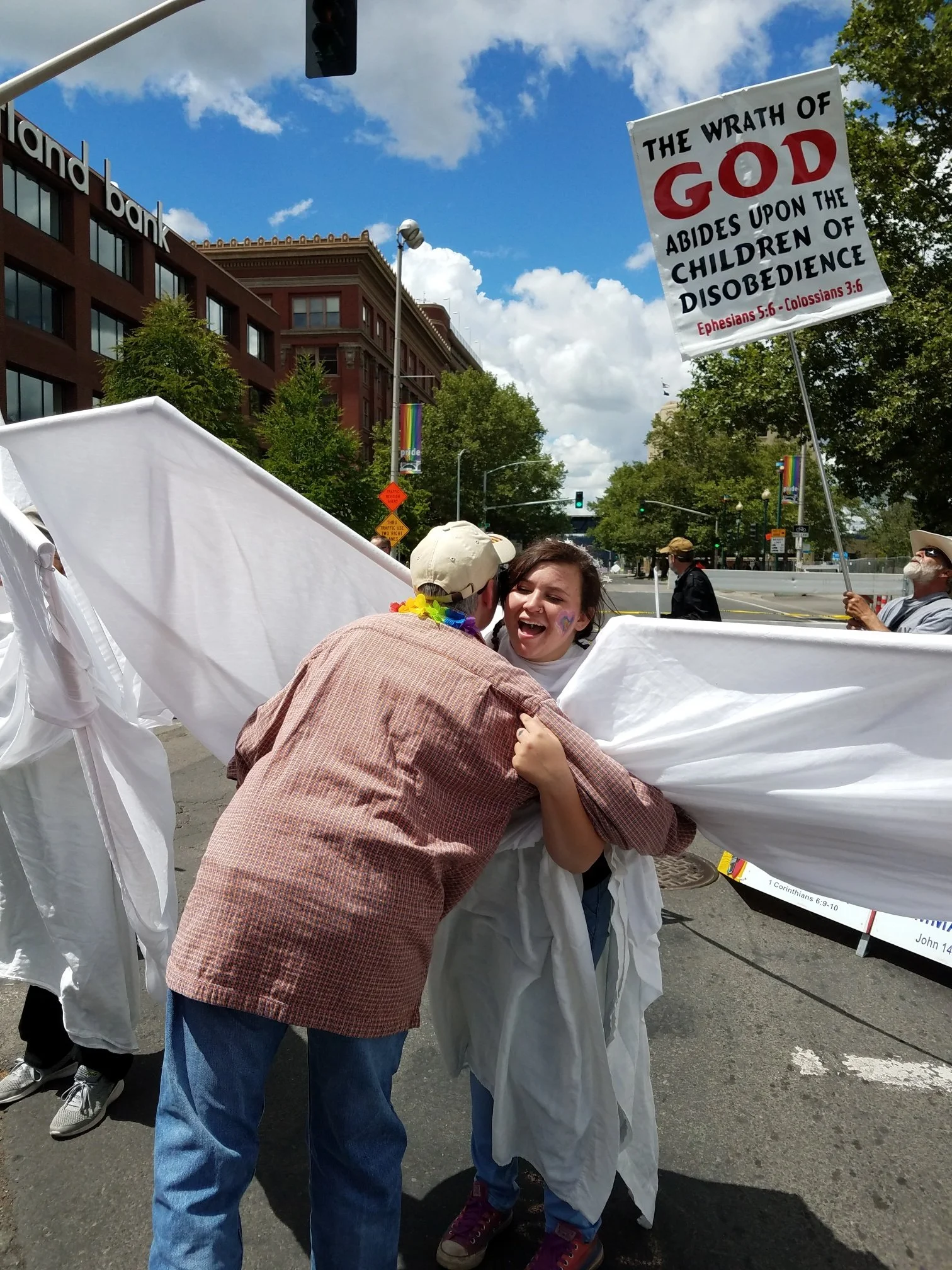 The Angels have gotten really popular this year. The protesters were moved to a corner across from Riverfront Park and we were right there to block them even in the rain. We had 15 Angels show up this year and there were only 5 protesters. To see the smiling faces and get the hugs we got when the parade goers saw us instead of the protesters was amazing.